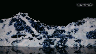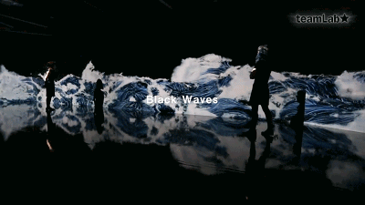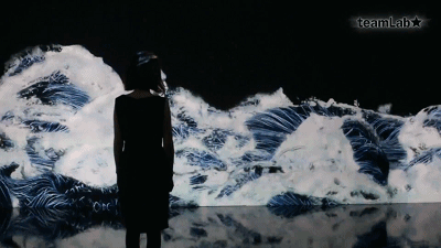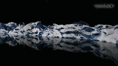 TeamLab設計團隊的靈感起源,則來(lái)自近現代日本的水文化,他們在計算機生成的三維空間中模擬了水波的運動(dòng),在計算了數十萬(wàn)粒子的相互作用后,水就被表示為一個(gè)連續的物體。為了表示波浪,提取了水表面粒子的行為,并繪制了與粒子運動(dòng)相關(guān)的線(xiàn)條,從而在三維虛擬空間中產(chǎn)生了三維波浪,然后按照teamLab所稱(chēng)的“超主觀(guān)空間”,將其變成了一件偉大的藝術(shù)品。